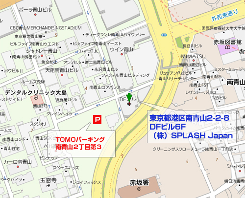 (株)スプラッシュ ジャパンは、都営大江戸線、東京メトロ半蔵門線、銀座線が乗り入れている青山1丁目駅の5番出入口から外苑東通りを麻布方面に向かい徒歩2分!