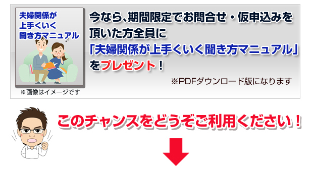 | 今なら、浮気調査無料リアルタイム コンサルティング利用者には、 スプラッシュ特製小冊子 「探偵今野のテレビで話せなかった、 とっておきの“裏話”」を無料プレゼント! 当てはまる状況をチェックして頂くだけで、あなたの抱える浮気問題を、浮気調査の専門家・探偵今野がいますぐ診断を行い、結果をメールでお知らせいたします。 |
